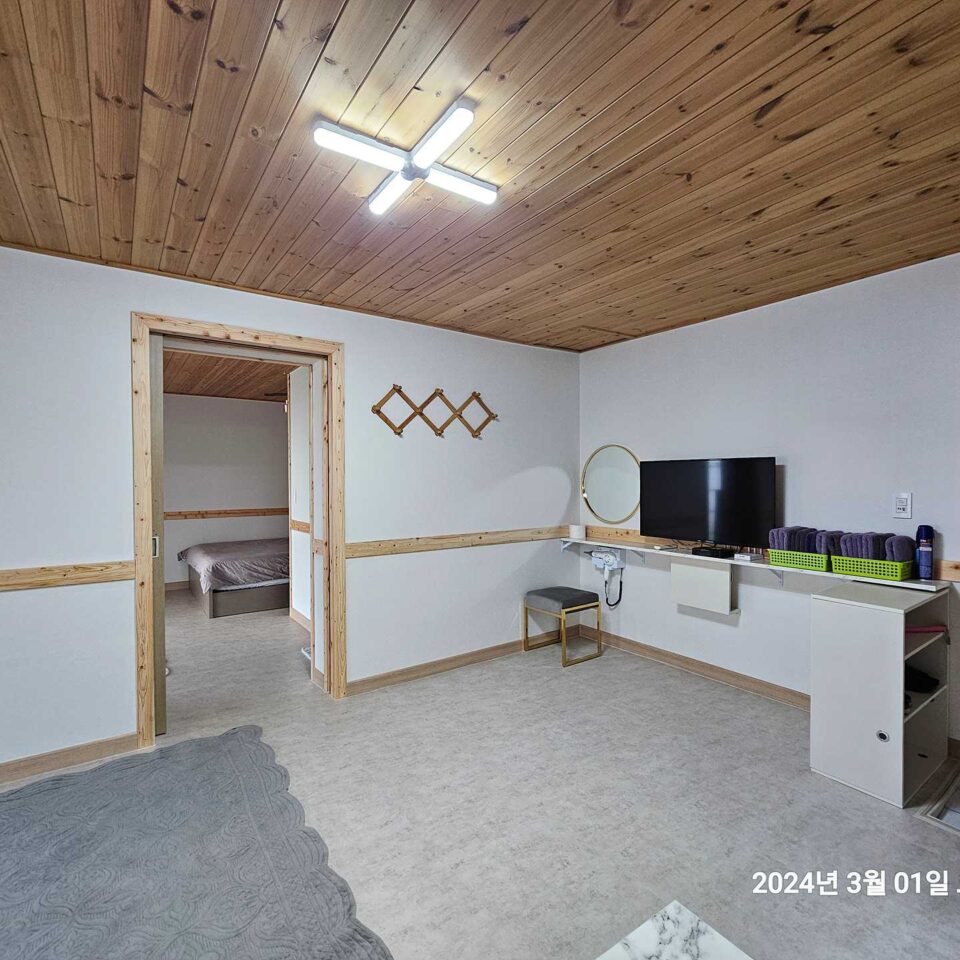 가족이 편안하게 머무를 수 있는 거실과 온돌 구성의 바다조망 객실 입니다. 거실 / 침대룸 / 욕실2개 / 주방 / 테라스 / 개별바베큐 바다1바다2바다3바다4바다5 실시간 예약하기 ※ 인원 및 추가 요금 기본 5명~최대 8명 기본 인원 초과시 인당 2만원의 요금 추가 ※ 입실·퇴실 안내 입실 15:00 이후 / 퇴실 11:00 이전 ※ 구비시설 TV, 에어컨2대, 냉장고, 밥솥, 전자랜지, 취사도구, 드라이기, 욕실용품